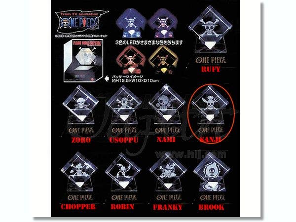 Master chef Sanji's personal "Jolly Roger" pirate flag is featured inside a clear cube crystal and will measure about 9cm tall when set atop the included pedestal. The custom series title-imprinted pedestal contains three LEDs that will create a cool gradation lighting effect when switched on. Three AAA batteries are required, not included.