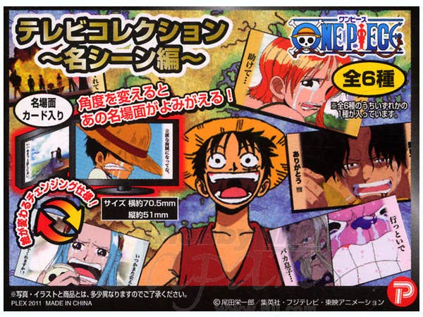 These nifty little "TV screens" display different memorable scenes from "One Piece." Each "screen" is about 7.5cm by 5cm; there are 12 different available scenes to trade and collect. Sold by the randomly packed box of 12.