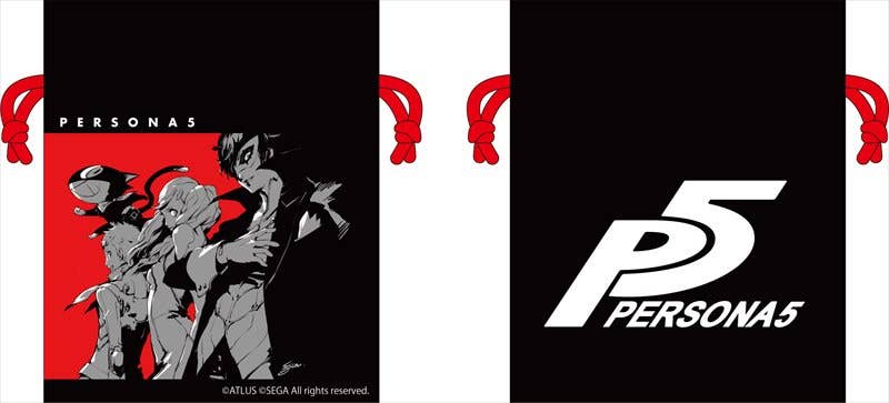 From "Persona 5," carry your small goods in this drawstring pouch featuring the Hero, Morgana, Anne Takamaki and Ryuji Sakamoto! It's made from 100% polyester and measures about 14.5cm by 17.5cm.