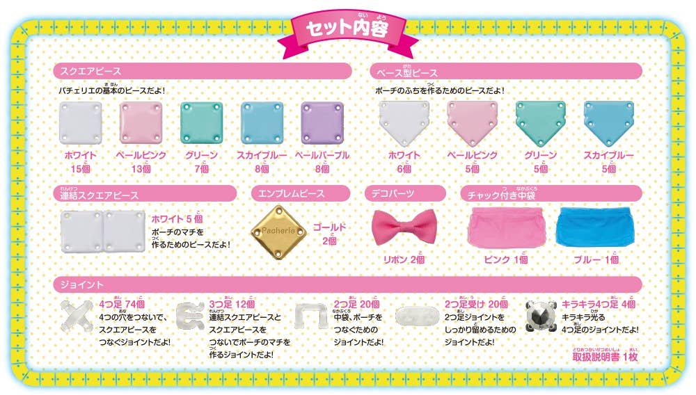 The pack includes a variety of colors and decoration pieces, which you can build into two pouches, uniquely designed by you! There's an endless number of color combinations and patterns to choose from. Order today!