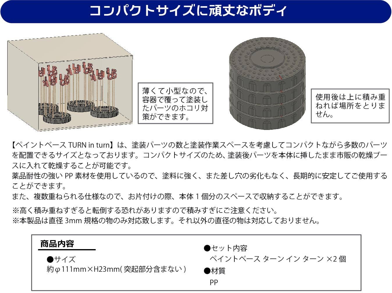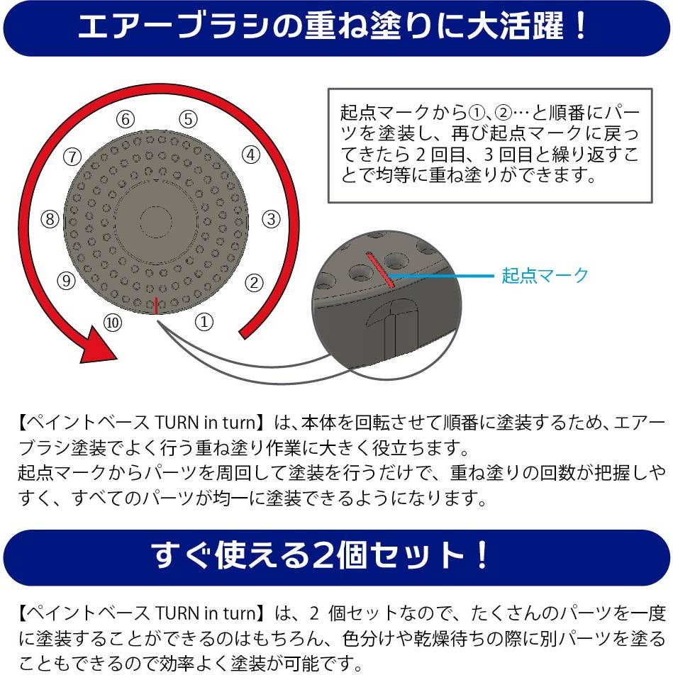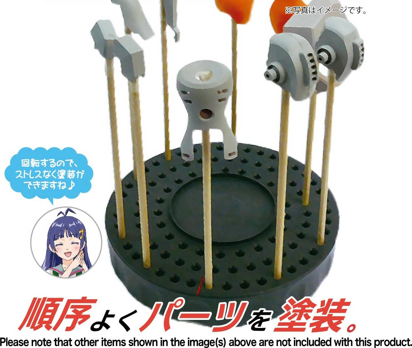 Why hasn't someone ever thought of this before? The TURN In Turn painting base allows you to paint your model-kit parts in order, and to easily keep track of them! The base unit features lots of 3mm diameter holes, able to accept any painting stick, bamboo stick, plastic stick, etc., and you can place them in the order you prefer. To paint, simply choose your first piece, remove its stick from the base, and paint, then return it to the base and move on to the next stick. Once you've gone all the way back to the beginning, your pieces are painted and ready for the next coat, shading, weathering, etc.! Sufficient space is allowed so that your parts don't need to be crowded together, too. You'll get a set of two TURN In Turn bases; they clean up easily, and stack together when not in use. The anti-slip base means the TURN In Turn will stay securely in place on your workbench or desktop while you're working, too! It's perfect for brush painting, airbrush, spray cans, etc. You'll wonder how you ever got along without it -- order yours today, and make painting parts a pleasure!