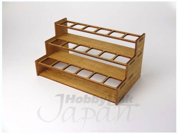 Unassembled and unpainted wooden parts. Holds up to 18 paint bottles.