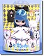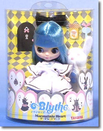Yet another Alice in Wonderland ripoff, this blue-haired Petite Blythe is wearing a pale blue dress with a white pinafore over it; she comes with a plush white rabbit, hair ribbon, paper key, paper jar of marmalade, and a Petite Blythe figure stand.