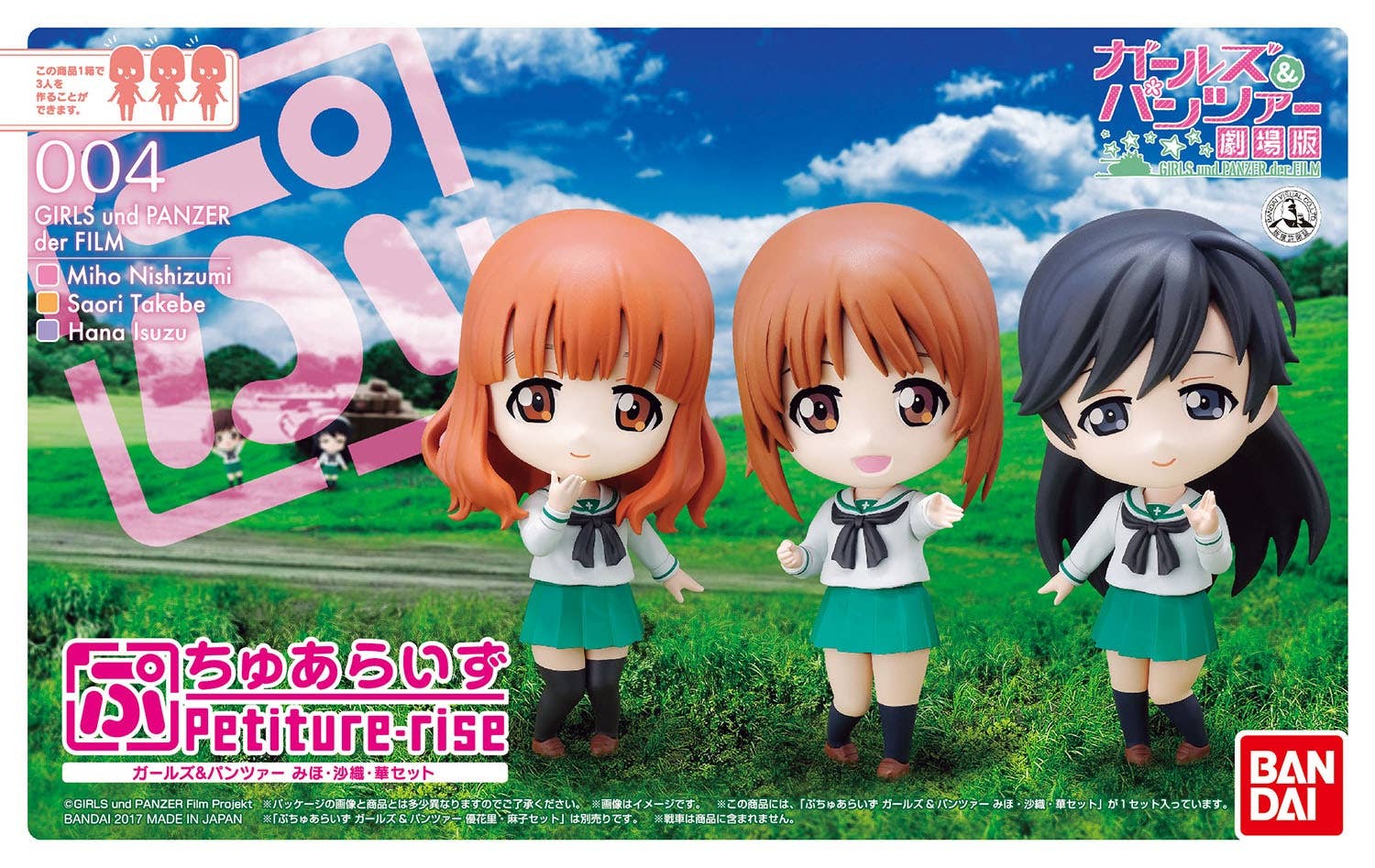 With this Petiture-rise kit set from Bandai, you can build cute mini figures of Miho, Saori, and Hana from "Girls und Panzer"! Each character will measure about 11cm tall when completed. Order today!