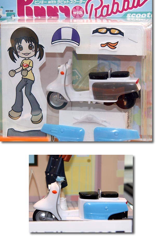 Adorable Pinky figure with a Rabbit scooter comes with plates to change the colour of the scooter's sides and handlebars; goggles; and a helmet. Pictorial instructions on the back of the packaging will assist you with the modifications, using the kickstand, etc.