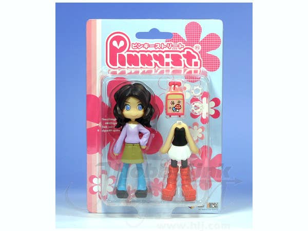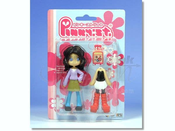 Small and 100-percent cute, this freckled Pinky Street figure has pale blue eyes, wavy brown hair, and two different outfits to wear, as well as a rolling suitcase and a pair of spikey bracelets for accessories. Like all Pinky Street figures, her clothing is fully interchangeable and mix-and-match! Please note that figures such as this are mass produced, and as a result some inconsistencies in finish and painting may occur; these are not considered manufacturer's defects. If you absolutely must have perfection, prepare to do some touch-up work on your own.