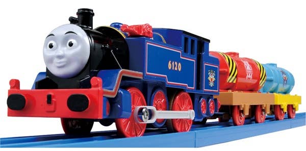 Belle, first introduce in the 2012 Thomas the Tank Engine special "Day of the Diesels," and she's now joining the PlaRail Thomas series from Takara Tomy! The three cars can be separated, and can be operated by hand if you put the switch into the "Off" position. Requires 1 AA-size battery, not included.