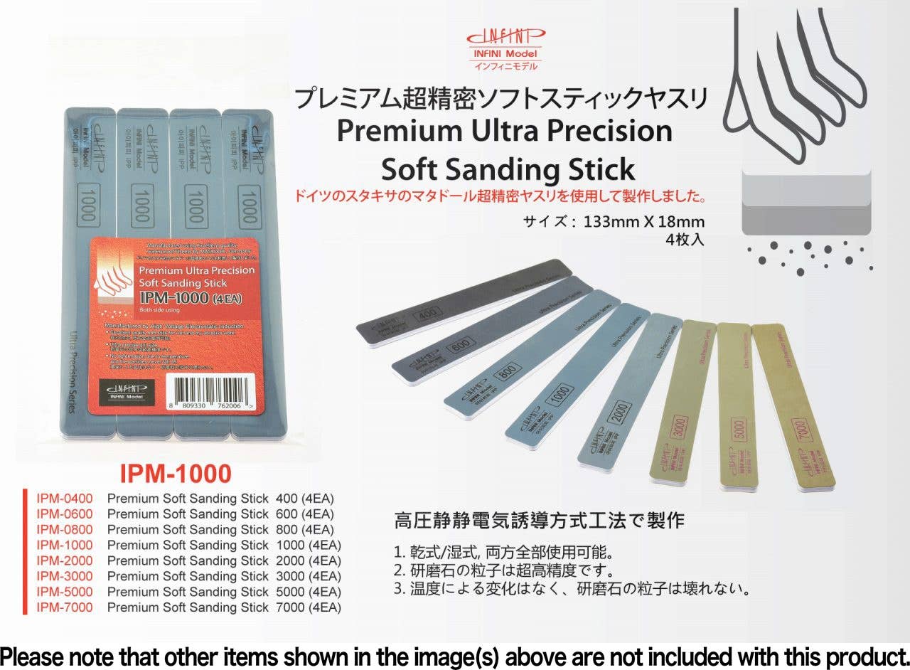 This sandpaper set contains 4 double-sided, ultra precise IPM-1000 premium soft sanding sticks and boasts excellent quality soft sticks for wet and dry abrasive work, ultra precise grit sizes and no deformation due to temperature.