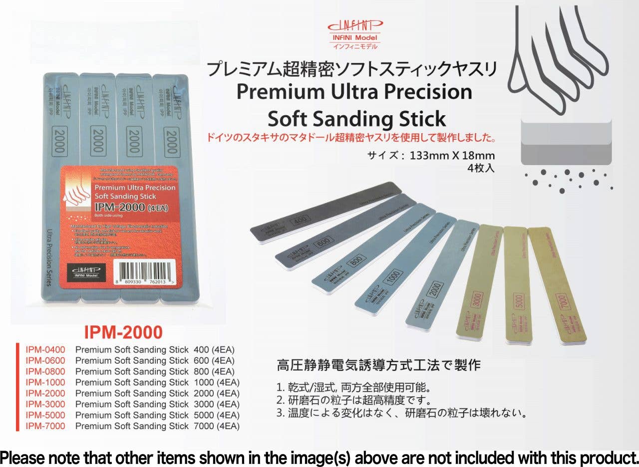 This sandpaper set contains 4 double-sided, ultra precise IPM-2000 premium soft sanding sticks and boasts excellent quality soft sticks for wet and dry abrasive work, ultra precise grit sizes and no deformation due to temperature.