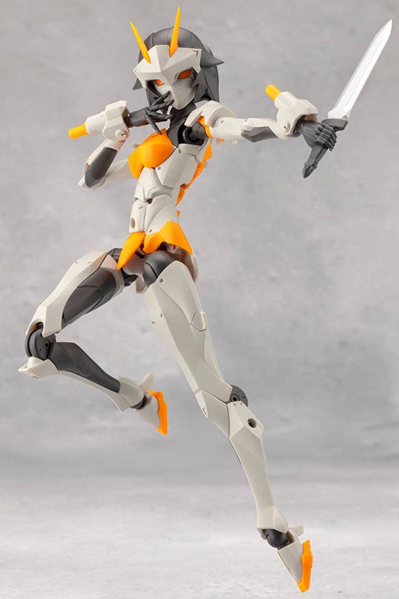 She has approximately 50 movable points when assembled; her knee joint has a single-joint structure, but it bends deeply, and the knee armor can be adjusted by moving it independently. The shoulders have multiple joints so her arms have a very wide range of motion -- she can cross her arms, hold a sword with both hands, and more! The torso's range of motion is also excellent, so she can adopt lying down poses with no problem. Her neck can move forward, backward, left and right, and her elbows are bent at a deep angle. The left and right hip joints are independent and have a structure that allows them to move widely toward the front, allowing flexibility-exercise poses, and her legs can be opened wide to left and right for a wide range of performance ranging from high kicks to compact sitting poses. An integrated version of the buttock armor is included where the left and right sides are not independent.