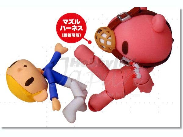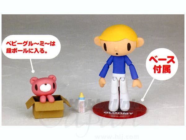 Return to the beginnings of Pity-kun and Gloomy's embattled relationship with this awesome figure! This game-prize item from Taito is bigger than their regular Revoltech incarnations--PIty-kun is about 8.5cm tall! He comes with a stand, the alarmingly cute Baby Gloomy, a baby bottle to feed Baby Gloomy with, and a little "cardboard box." Pair him up with grown-up and grouchy Gloomy from the other set (linked below) for lots of excruciatingly violent fun!