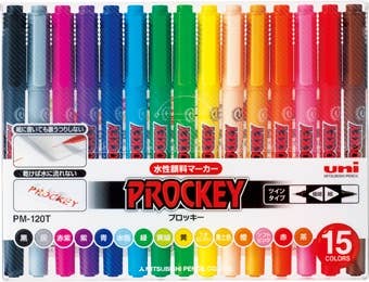 Here's a set of high-quality Prockey felt-tip markers in 15 vivid colors! The ink is water-based so it doesn't have an unpleasant odor, and produces vivid colors with excellent fade resistance. Let the ink dry to write over it; it features excellent light resistance, and will not run if it's allowed to dry. Will write on paper, metal, photos, plastic, etc. Colors include: black, ash, red-violet, purple, blue, light blue, green, yellow-green, yellow, peach, yellow ocher, orange, soft pink, red and brown.