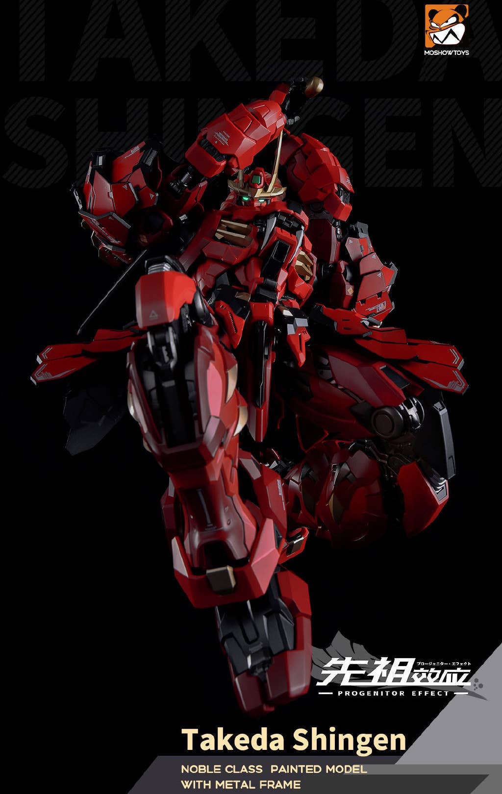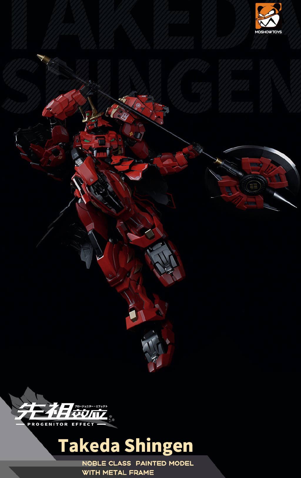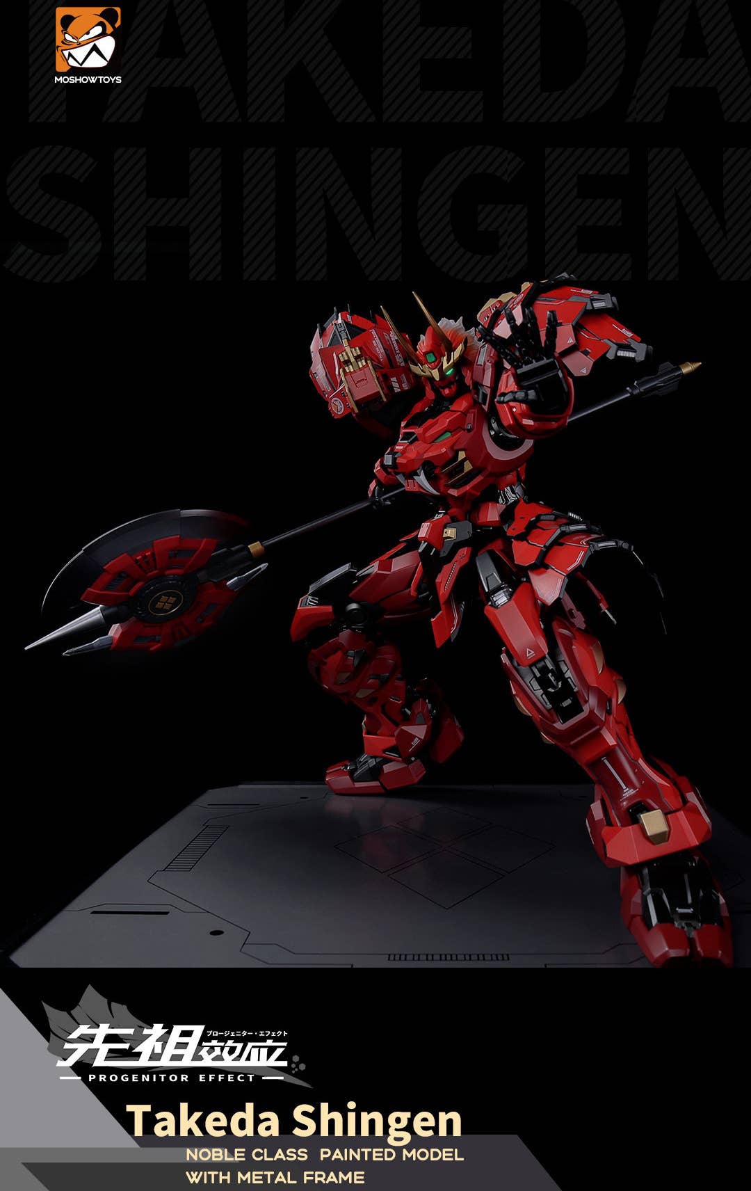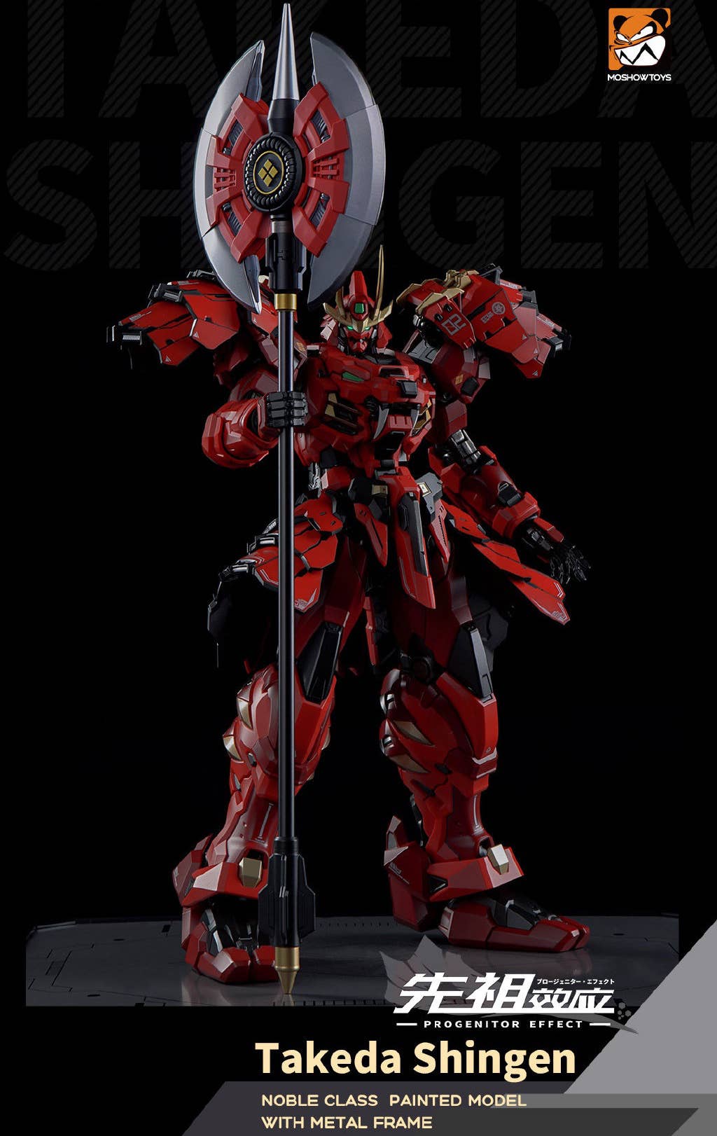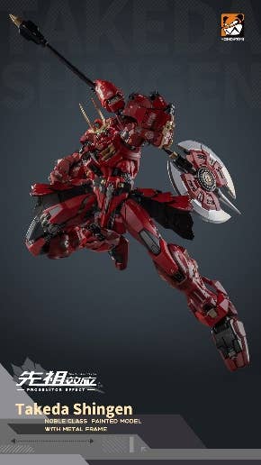 The first entry in Moshow Toys' original alloy posable figure series "Progenitor Effect" is back! The Noble Class Takeda Shingen is an original mecha with a design inspired by the Sengoku warlord of the same name! Its red samurai-style armor has a powerful form, and you can feel its dignity as a military commander with the rich, color-soaked painting. A sword and axe are included as weapons. Order this majestic mechanical warrior for your own collection today!