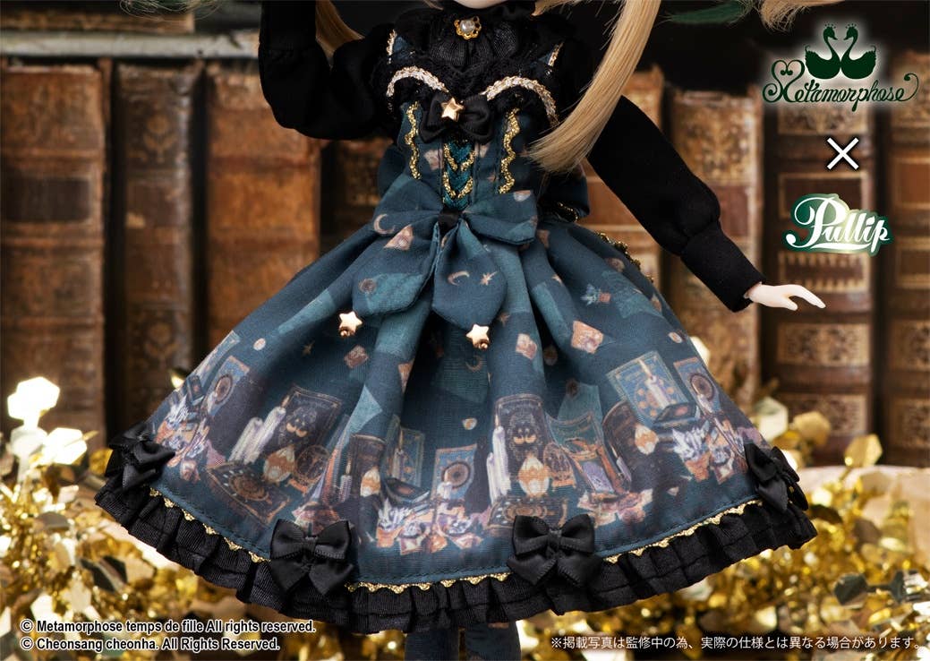Groove collaborates with the clothing brand "Metamorphose temps de fille" to bring us Pullip Chatte Noire! She wears cute black cat ears that are detachable; her stylish cape also has black ears on the hood. Her jumper skirt reproduces an original pattern, and it's loaded with ribbons and frills for a gorgeous atmosphere. Her catlike face is made even more charming by gleaming stars under her eyes, and her twin tails are a clip type, so they can be easily removed if you like. Order this pretty kitty for your own doll family right meow!