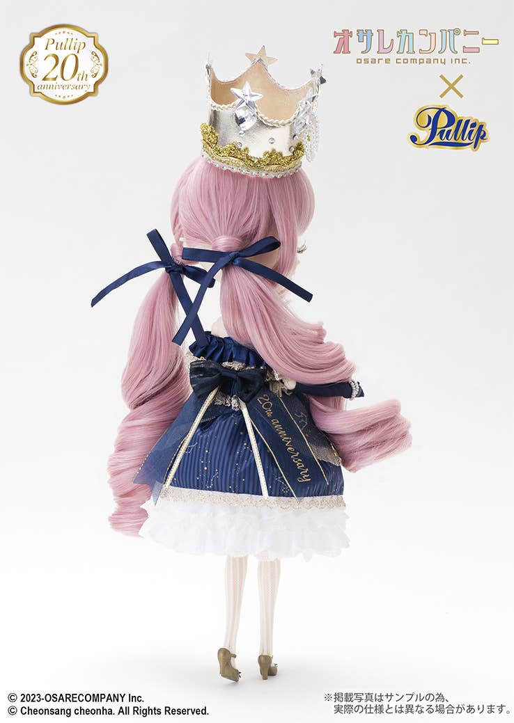 Celebrate the 20th anniversary of Pullip's birth with this very special doll from Groove! In a collaboration with Osare Company, which makes costumes for idols and stage performances, Emma wears a dress that proves she's the cutest idol in the whole galaxy! The luxurious costume features a luxurious overskirt with a starry print and plenty of beads, ribbons and lace; her removable crown is loaded with glitter, stars and strings of beads! The vest and overskirt can also be removed to transform Emma into a pure-white princess! The dress underneath is full of frills and lace. Emma's makeup is conscious of the energy of an idol, with delicate eyelashes and eyeliner. Her eyes are a special gray-green color that looks good with many different outfits, and her curly pink hair sways when she dances on stage. You'll love her -- order her for your own doll family today!