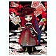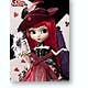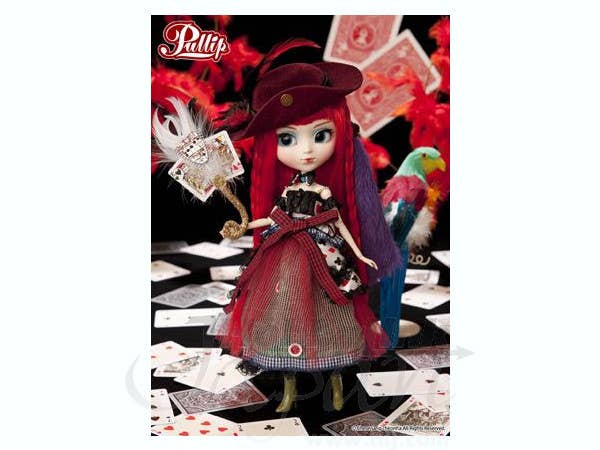 Pullip Ludmila is ready for a card party! She's wearing a charming zippered corset-style top over a two-part skirt, with red tulle over a skirt made of striped fabric trimmed with big buttons. An apron decorated with hearts, spades, clubs and diamonds continues her playing-card theme; she's got a beautiful feathered fan to carry that's also trimmed with playing cards. Her striking scarlet hair is accentuated by a faux-fur hair accessory in violet, and her feather-trimmed hat is really amazing! Her choker mimics a shirt collar. If you like, you can remove her skirt, and she can show off her patterned tights and green boots. Bright aqua-blue eyes are set off by matching eye shadow--she's really colorful and striking! She also has a collector card for you, and a stand too. This beautiful card sharp is ready to meet you today--make her yours now!