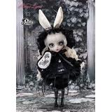 Pullip Mayle plans to look for a rabbit in her dreams tonight! This gorgeous doll is a collaboration between Groove and the fashion brand Rouge Ligne (which is a collaboration between the illustrator Youkai, and the designer Aya of the brand Princess Doll). This adorable goth-loli girl is based on illustrations drawn for the brand's products! Her glossy white-blonde hair features a series of luscious vertical-roll curls for extra volume; an original print of phases of the moon decorates her dress. Her stark makeup is inspired by the girls seen in Youkai's illustrations; her dress features plenty of frills and hanging black ribbons. The brand's popular blouse and headdress are also reproduced perfectly in doll size! The rabbit ears on her headdress are exclusively made just for this doll, and she comes with an original print rabbit cushion, too! Hop to it -- order this pretty bunny for your own collection now!