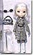 Not sure why she's called "Nero", since she's awfully pale! Nero has platinum blonde hair, irises without any discernable colour, and skin the colour of piano keys! Her chic coatdress features a black houndstooth check with gold threads running through it; her ensemble is topped off by huge sunglasses and an abstract-patterned purse.