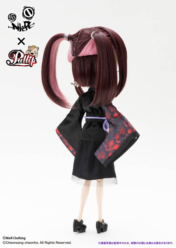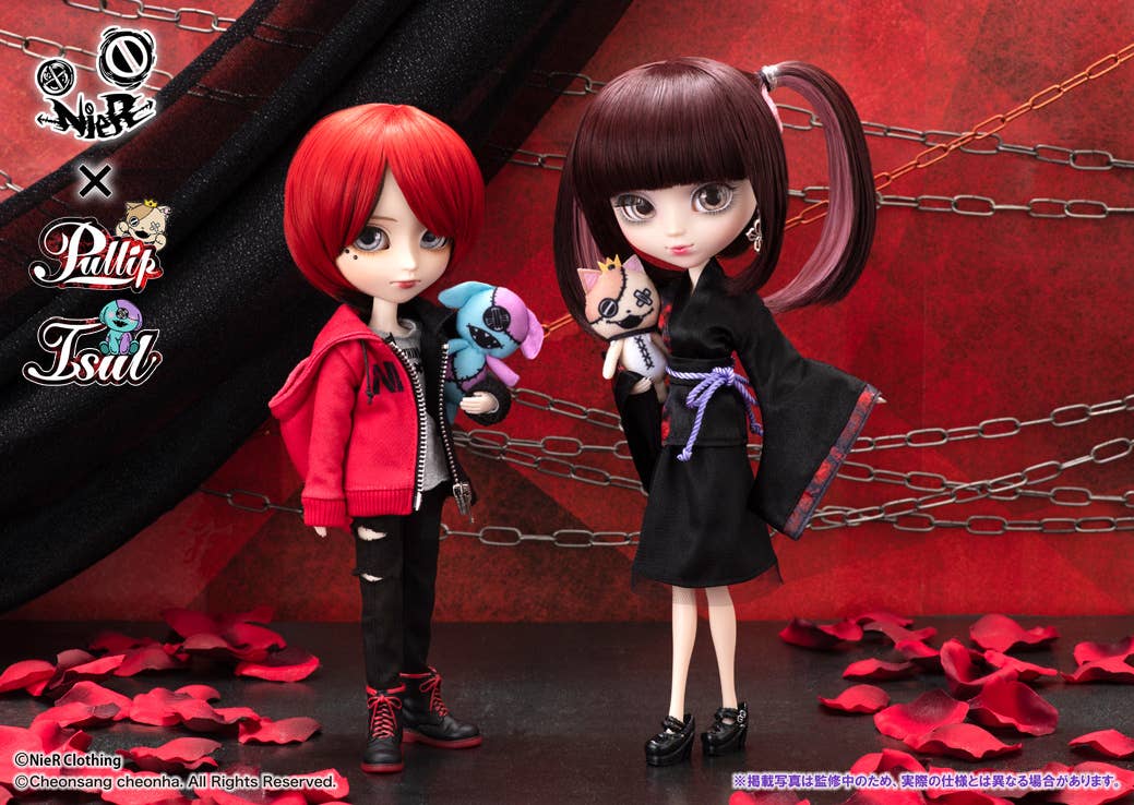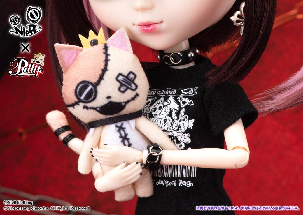 Groove enters into their second collaboration with NieR Clothing to bring us Pullip Yami! Yami wears a coordinated outfit that incorporates doll-sized versions of many of the brand's most popular items; her kimono-sleeve haori with a red amaryllis print looks cute with or without its obi belt. The T-shirt she wears underneath can also be worn as a dress! Her wig has a sweet twin-tail style with a pink inner color for extra flashiness; you can attach the hair ornament to the base of one of the tails for extra fun. She also has a stuffed toy of the brand's original mascot character, Mike! He's the perfect size to fit in her arms. Yami also wears a choker and bracelet that match Isul Nao, who will be released soon -- display them side by side, and you'll have a captivating couple in your collection! Order yours today!