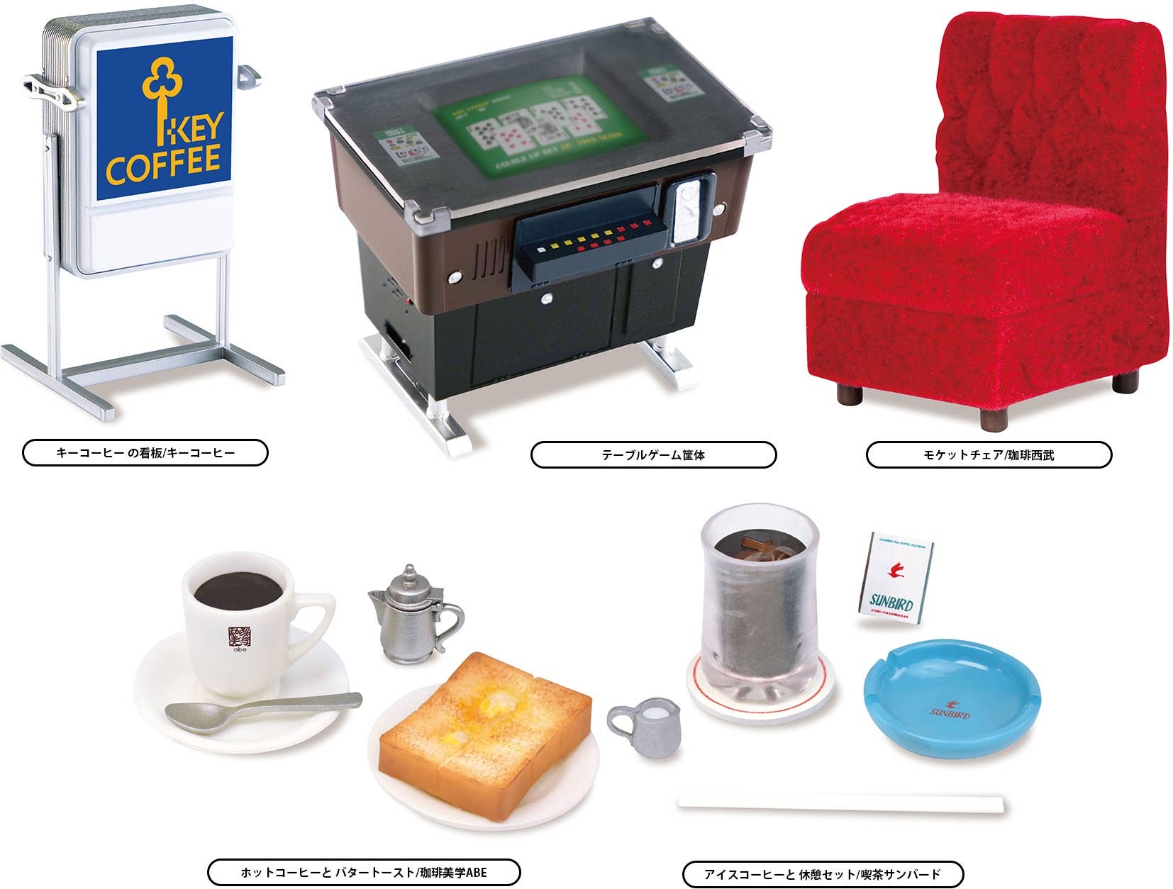Ken Elefant's retro coffee shop miniatures are back! The lineup includes everything you need for a touch of nostalgia together with your caffeine -- a sign to set up on the sidewalk out front, a comfortable chair, a table-style video game, and of course a cup of delicious coffee to enjoy at your leisure! There are five different items, randomly packed in boxes of 12 -- place your order today!
