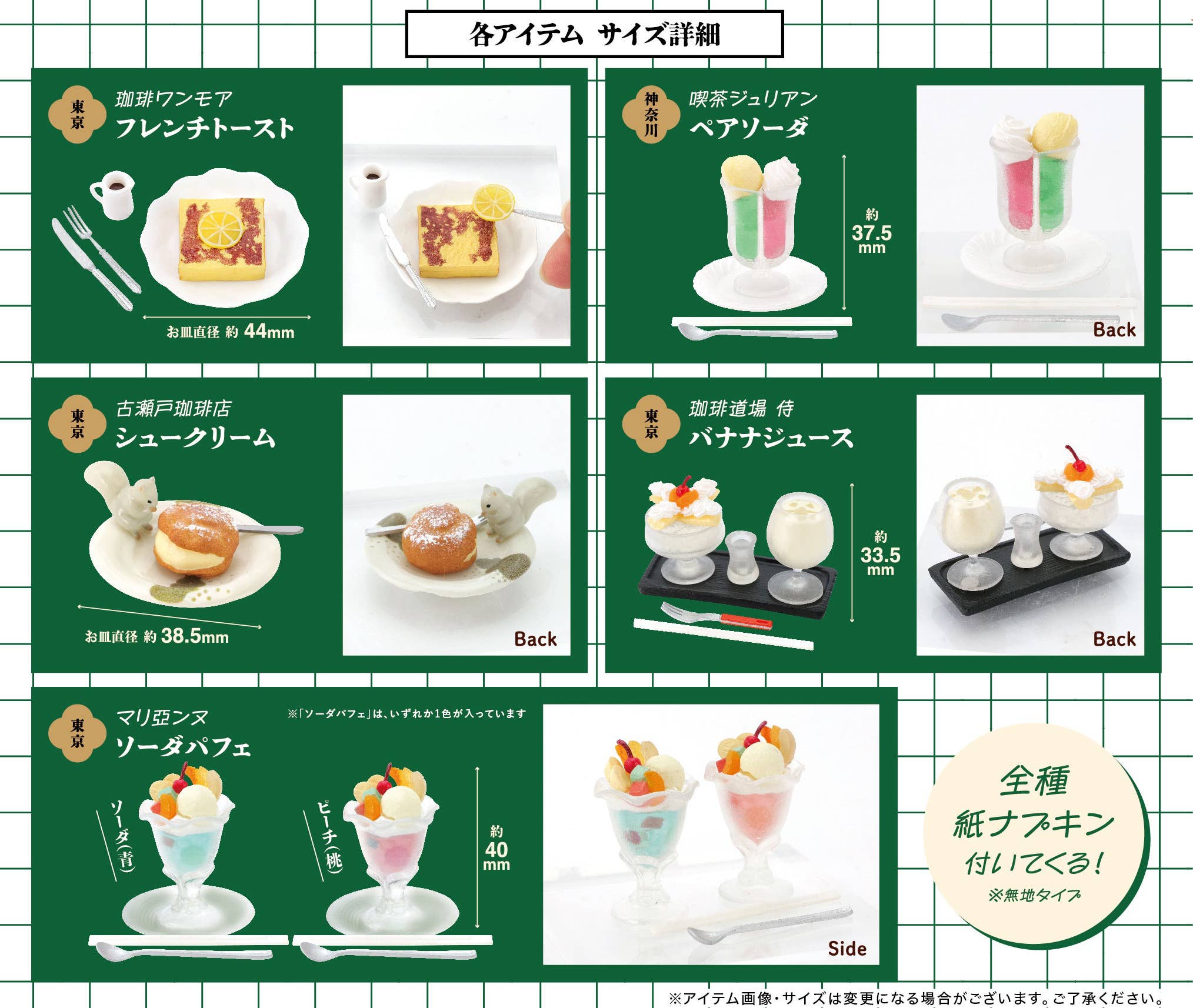 Hope you saved room for dessert! This lineup of miniature food items from Ken Elefant brings us signature desserts from historic cafes across Japan! There are five different items to collect and trade, randomly packed in boxes of 12. Place your order today!