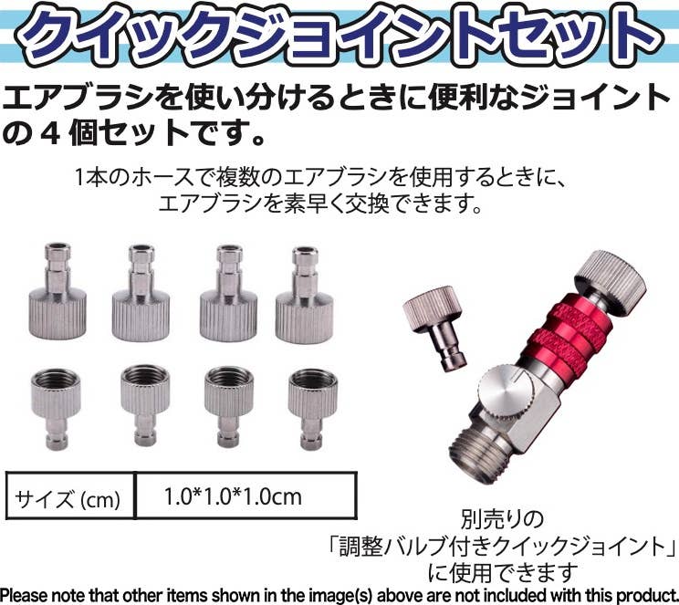 A four piece set of joints that is convenient when using different airbrushes. By combining with the optional quick joint set, you can install and remove up to 4 different airbrushes with one touch! Quickly change airbrushes with only one hose with this handy set.
