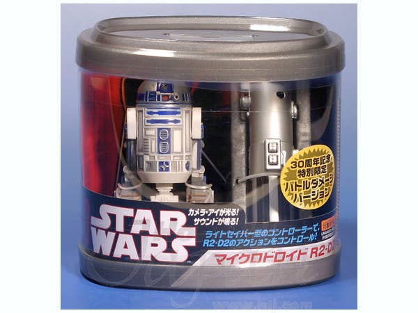 Lights! Sound! Action! Yup, this little radio-controlled "micro-droid" R2-D2 from Takara Tomy has it all! A nifty lightsaber-shaped controller gives you command over the accurately detailed little fellow, making him go forward, reverse to the left, and rotate his head. Spunky! His "camera eye" lights up, and the lightsaber control unit puts out delightful R2 sounds! Requires four L44 button-type batteries (short-life test batteries are included). This is a 30th Anniversary special edition figure, with realistic "battle damage." Well, he's just kind of scuffed up a bit and weathered, but it is quite nicely done. This IS the droid you're looking for!