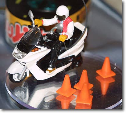 Lovely little Choro-Bike R/C scooter comes with a built-in rider and everything you need except three AA batteries, to race by yourself or against your friends. The controller acts as a charging station for the bike as well as providing forward, reverse, left and right directions. Also comes with pylons for steering practise!
