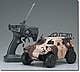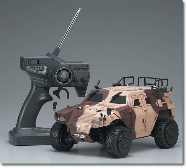 A fully assembled and painted 1/16 RC model of the JGSDF's Light Armored Vehicle. Comes with a Perfex high-spec 2ch radio, with servo, receiver, and built-in ESC pre-installed. All you have to do is pop in the batteries (AA size, 8 for the transmitter and 6 for the chassis...14 in all!) and you're ready to run...and run it will! Up to 20kph/13mph! Comes finished in two-tone brown and sand desert camouflage.