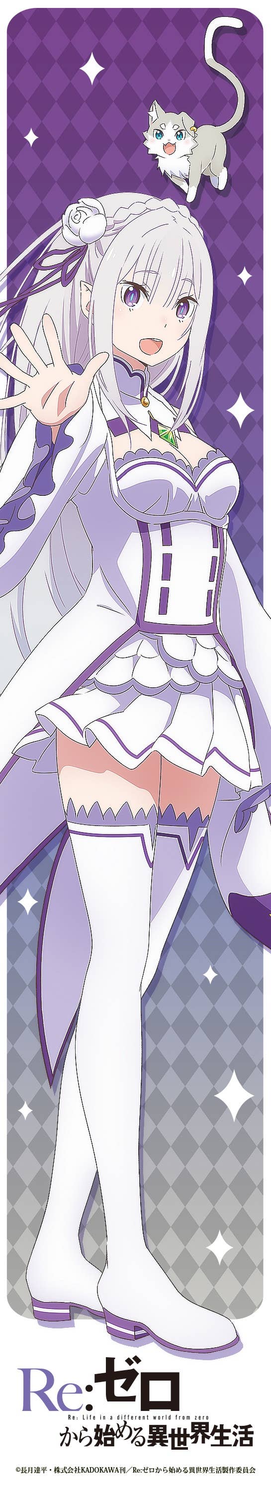 A muffler towel featuring full color artwork of "Re:Zero - Starting Life in Another World" characters Emilia and Puck together overtop a purple and grey background. Add this fun muffler towel to your collection today, order now!