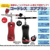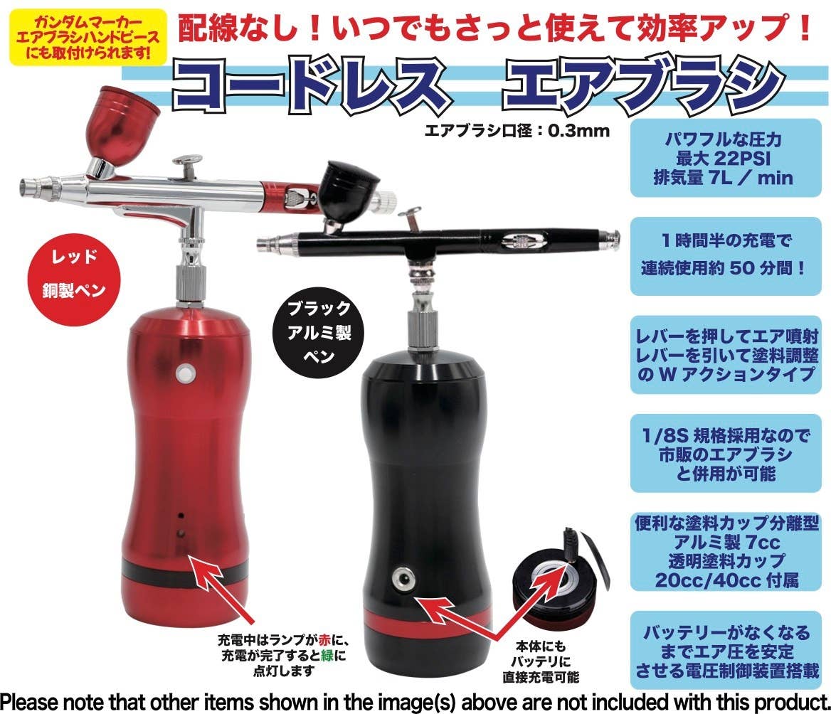 This wireless, rechargeable airbrush can be used anywhere and anytime for maximum efficiency! It features powerful air pressure of up to 22PSI, with an air volume of 7 liters per minute; it can be used continuously for about 50 minutes after charging for an hour and a half! Since the 1/8S standard is adopted, it can be used together with a commercially available airbrush too, and can be attached to the Gundam Marker Airbrush Handpiece as well. Three paint cups are included: an aluminum 7cc cup, and two clear paint cups: one 20cc and one 40cc. Equipped with a voltage control device that stabilizes the air pressure until the battery runs out. Order yours today!