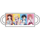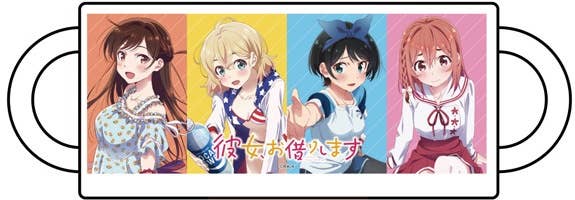 A white mug featuring full color artwork of all your favorite "Rent-A-Girlfriend" characters together overtop solid color blocks. Add this fun mug to your collection today, order now!