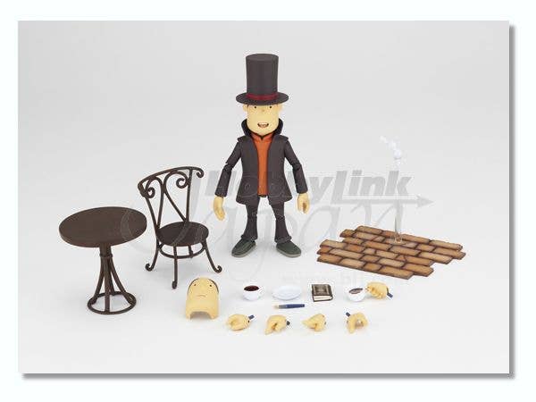 He's finally here! The world-traveling archaeologist Professor Layton, the hero of a series of puzzle-based games for the Nintendo DS, is now an incredibly posable Revoltech figure! Standing about 12.5cm tall (including his top hat), Professor Layton comes with amazing accessories: an elegant round table and chair, a teacup and saucer, his ever-present notebook and pen, five spare hands (including one holding a teacup), and two faces--one with a serious pondering expression and the other with an "I've got it!" expression. Instead of the typical Revoltech base, the Professor comes with a well-done brick-look base and a posing arm to help him stand. He's here and he's ready to share in all your adventures--take him home with you today! Please note that the photos shown are of a prototype; the production version may vary. Also, figures such as this are mass produced and as a result some inconsistencies in finish and painting may occur; these are not considered manufacturer's defects. If you absolutely must have perfection, prepare to do some touch-up work on your own.