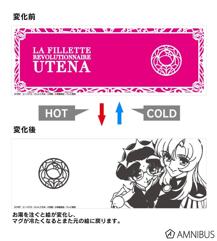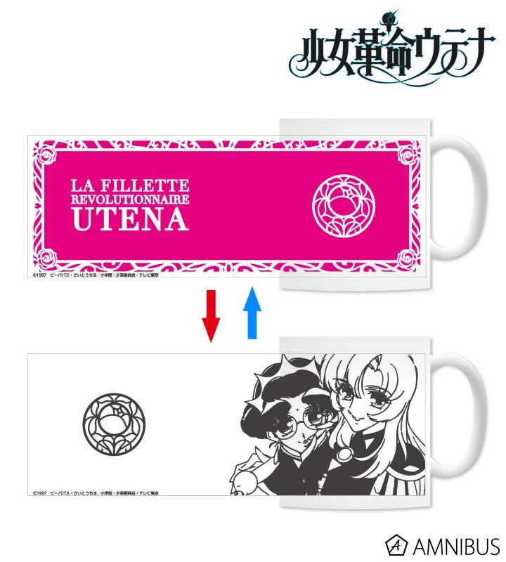 "Revolutionary Girl Utena" brings to you a new thermal-changing mug for you to enjoy! This mug reacts to heat, causing its outside artwork to change from a bright pink background with white text to a white background with black and white artwork of Utena and Anthy. A great addition to any fan's collection. Order today!