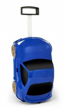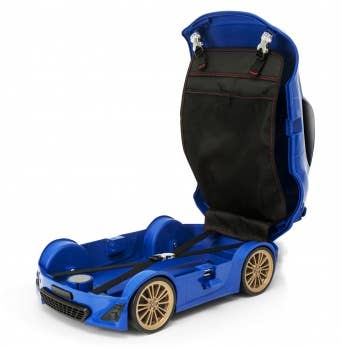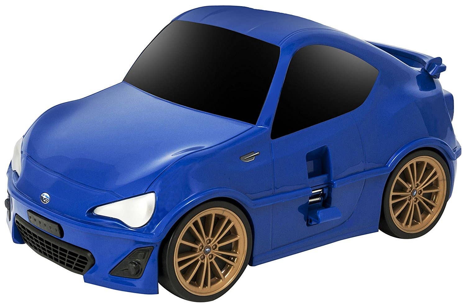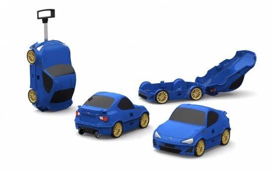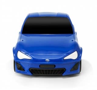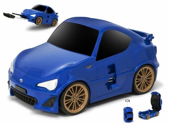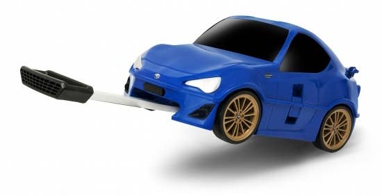 This fun travel case is shaped just like a cute version of a Subaru BRZ, in sporty blue! It's 25cm tall by 50cm long by 31cm wide, and features two retractable handles, four functional wheels when in "car" mode and two when in upright suitcase-towing mode, and a lock. Kids will love it!