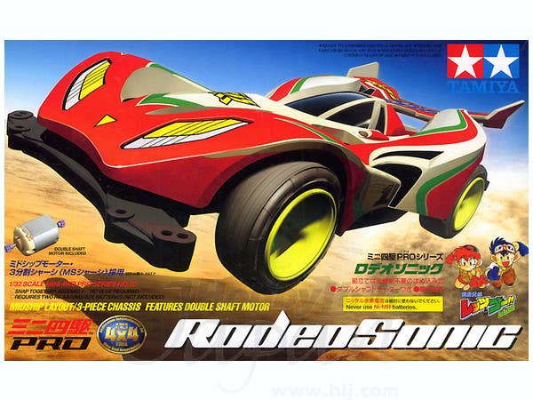 These terrific little Mini 4WD cars feature snap assembly (so no glue is required), race-tuned chassis, and racing wheels with rubber tires, plus double-shaft motor. Required are two AA (UM3) batteries, not included. This particular kit depicts the Rodeo Sonic racer from the manga and anime "Bakuso Kyodai! Retsu & Go" ("Speedy Brothers! Let's and Go!"), the story of two Mini 4WD-crazed youngsters. Tamiya's Mini 4WD cars are specifically meant to race on Tamiya's racing circuits.
