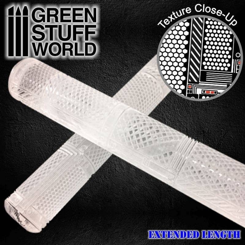 Textured rolling pins capable of impressing a continuous repeat pattern on clay and putties. Made of clear PMMA plastic with amazing non stick properties. Not toxic. They come in several different textures that you can purchase based on your specific needs.