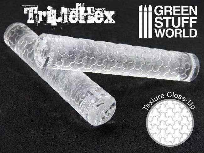 Textured rolling pins capable of impressing a continuous repeat pattern on clay and putties. Made of clear PMMA plastic with amazing non stick properties. Not toxic. They come in several different textures that you can purchase based on your specific needs.
