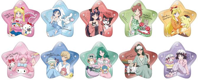 These star-shaped can badges feature "Sailor Moon" characters enjoying a pajama party with their favorite Sanrio characters! Each badge has a glittery background for an extra flashy appearance. There are ten different characters to collect and trade, randomly packed in boxes of ten. Place your order today!