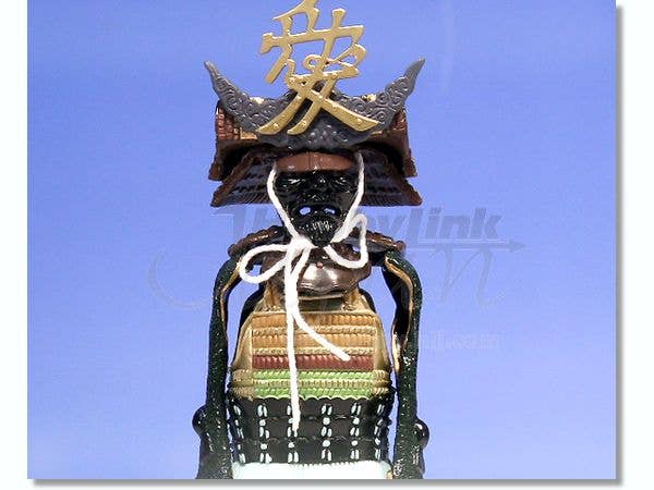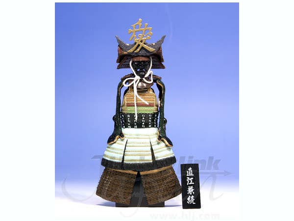 A completed, prepainted model of samurai armor that belonged to important Japanese historical figure Naoe Kanetsugu. Highly detailed and very accurate, the armor is mounted on a display stand in the traditional way.