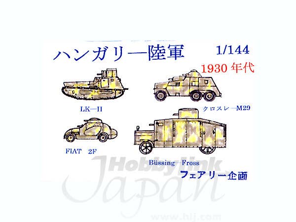 Beautiful little 1/144-scale resin-cast military kits from Fairy Kikaku of Japan! This set includes four vehicle kits, as shown here: LK-II, Crossley M29, FIAT 2F, and a Bussing Fross armored car. Markings not included.