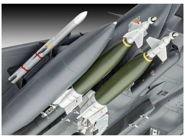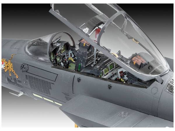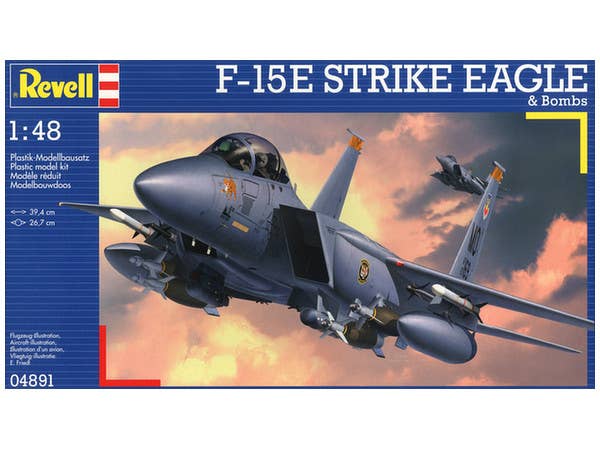 When completed, this model kit measures about 39.4cm long. This kit features detailed cockpit with ejection seats and instrument panels, separate air-brake flaps (optionally deployed), very detailed engine exhaust cone with separate control linkage, 2 additional fuel tanks, 4 GBU-10 bombs, 2 GBU-15 bombs, 4 Sidewinder guided missiles, LANTIRN pods, decal set for two F-15E aircraft of the USAF, and more!