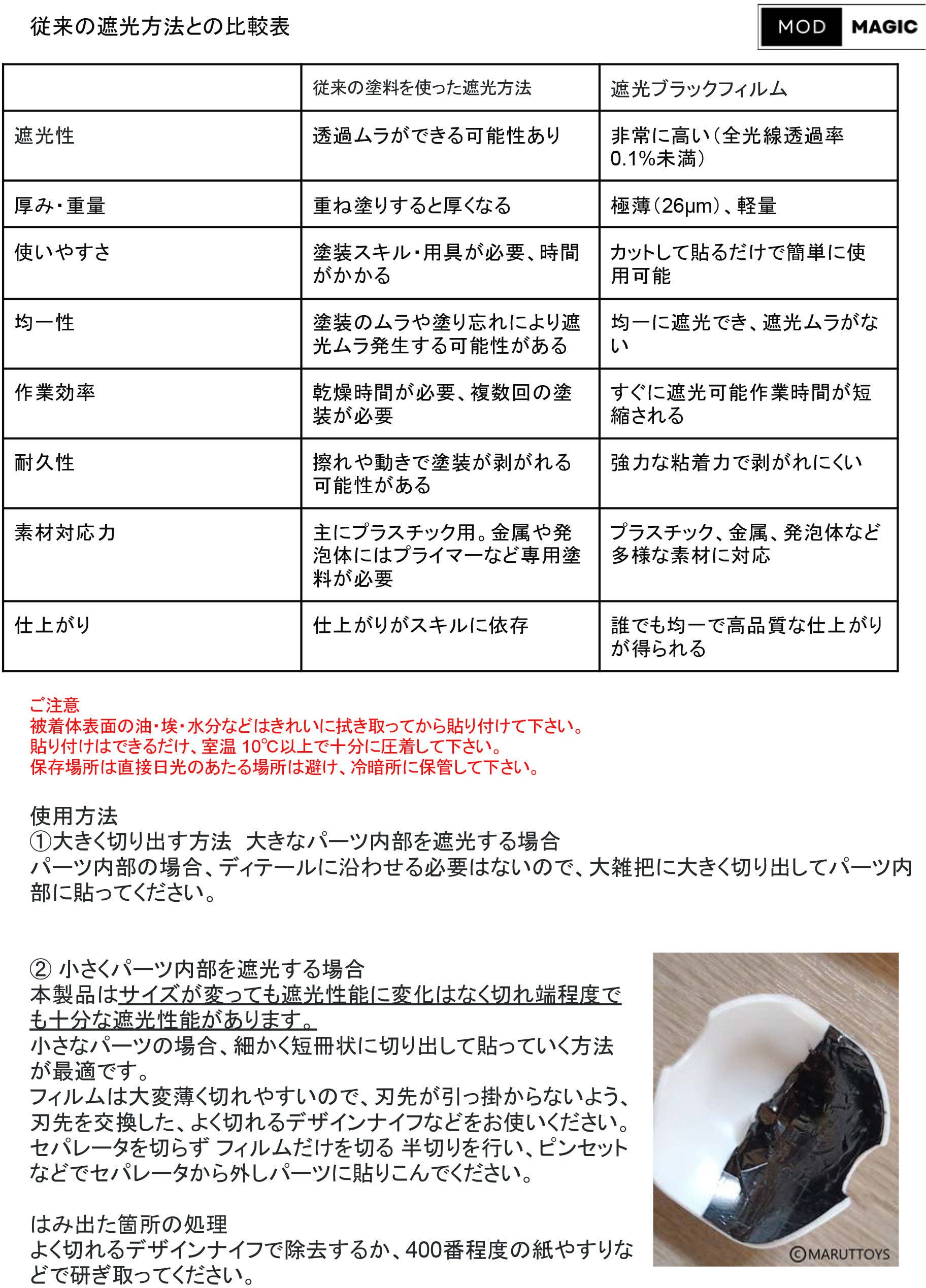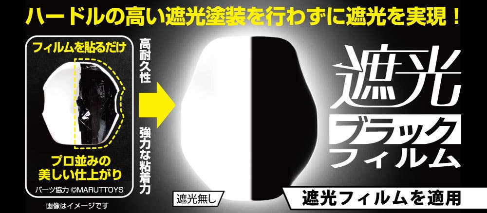 The "Shading Black Film" is an ultra-thin shading film that is easy to use even for beginners. By simply cutting and applying it, you can achieve beautiful, even shading without any inconsistencies. It reduces work time and fits perfectly on curved surfaces and small parts. With its strong adhesive power and durability, it supports professional-level, beautiful results. This new product in the popular film series enhances the quality of lighting effects without the need for complicated painting work, allowing you to improve your model's lighting quality with just scissors or a cutter.