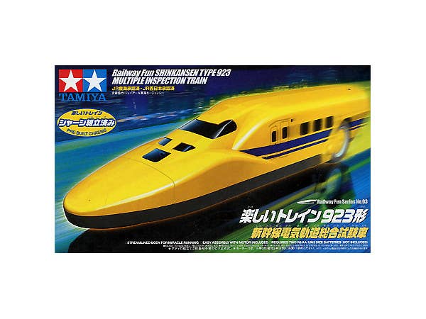 Here's the Shinkansen Type 923 multiple inspection train from Tamiya's new "Railway Fun" series of Shinkansen "Bullet Train" racers! Similar in design to Tamiya's Dangun Racers, these kits feature a "streamlined body for miracle running" (that's what the box says!), a pre-assembled Type-1 chassis with motor already installed, and a colorful sheet of self-adhesive stickers. Requires two R6/AA/UM3 batteries (not included).