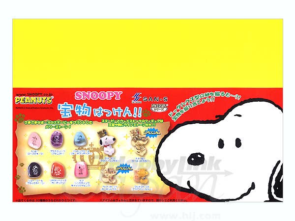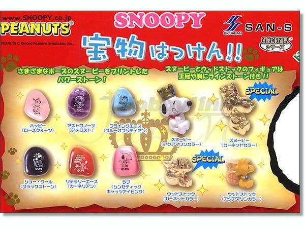 Dig for treasure with Snoopy! Here's a case of 24 individually boxed "Snoopy doghouses" made of compressed sand; chip away the sand with the included tool, and inside you'll find a fantastic treasure! You might find a polished semi-precious stone with a Snoopy image on it: happy dancing Snoopy on rose quartz, Astronaut Snoopy on amethyst, the Flying Ace on blue obsidian, Joe Cool on "black stone," the World Famous Author (at his typewriter, of course) on carnelian, and "love Snoopy" on pink catseye. Or there might be an "aquamarine color" miniature painted figure of Snoopy or Woodstock; or the most special of all--a golden "garnet color" Snoopy or Woodstock! There are 10 possibilities to trade and collect; sold by the randomly packed box of 24.Please note that the photos shown are of a prototype; the production version may vary. Also note that these are trading items and are individually sealed and randomly packed in boxes of 24 by the manufacturer before shipment to HobbyLink Japan. As a result we are unable to honor requests for individual or specific items, nor can we promise you which one(s) you will receive in a box. Please order only if you are willing to accept any of the possible types.