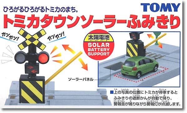 Requires 2 LR-44 (watch-type) batteries, though it has solar battery support. This neat railroad crossing lights up and sounds an alarm when your Tomica car (not included) approaches the rails. Have fun!