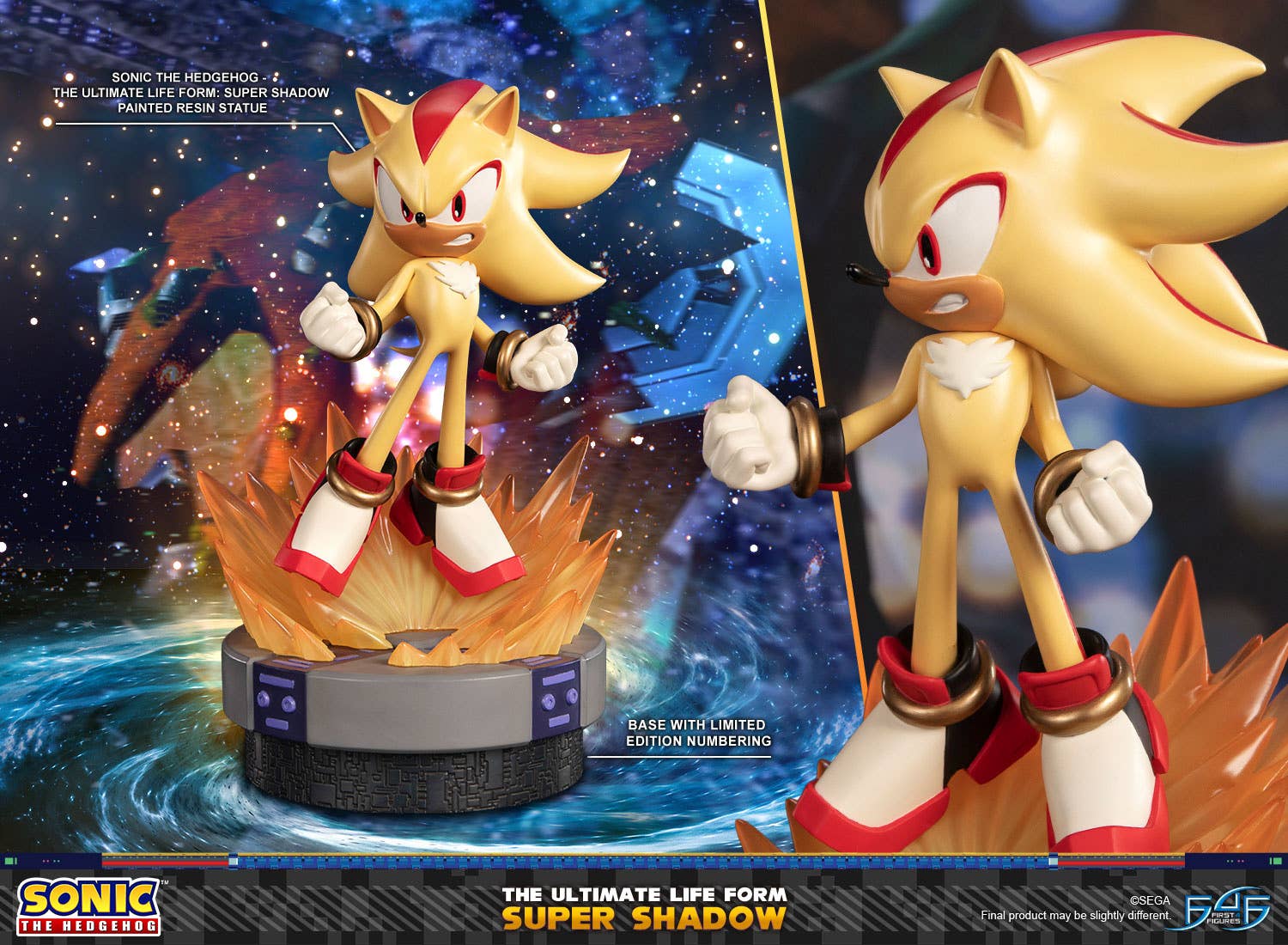 Shadow, Sonic's spitting image and rival, is transformed into Super Shadow by the power of the Chaos Emeralds in the "Sonic the Hedgehog" video game series, and he's now a statue from First 4 Figures! His detailed base is inspired by the Space Colony Ark from the climactic battle against Final Hazard in "Sonic Adventure 2." Order him for your own collection today!
