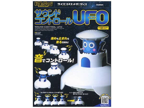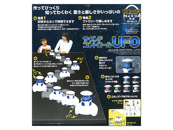 This wacky li'l UFO is controlled by sound! Navigated by a sound-sensitive remote control system, you can have hours of fun with this little guy. Measures 11.3cm tall and 11.5cm in diameter, and weighs 135 grams. The body is colored pearl white and deep blue. Simple assembly is required. Includes instructions in Japanese, but is very well illustrated. Three AAA batteries are required, not included.