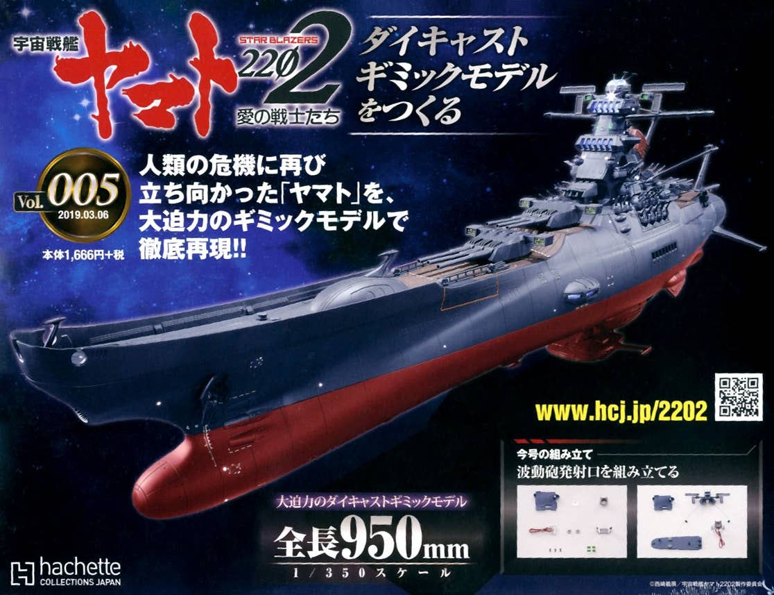 Here's part 5 in Hachette Collections Japan's weekly 110-part series of parts to build your own 1/350-scale die-cast model of Space Battleship Yamato, as seen in the recent "Space Battleship Yamato 2202" animated series! Loaded with nifty gimmicks like lights, sound, moving main guns, and removable panels, and measuring 950mm long upon completion, this die-cast Yamato is sure to be the jewel of any Yamato/Star Blazers fan's collection.