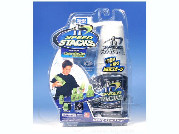 Hey kids, let's stack some cups! Well, not just stack 'em...Speed Stack 'em! Touted as a "new sport," the challenge is to stack cups in predetermined patterns as quickly as possible. Hours of endless fun! This set includes 12 plastic "competition cups" (with holes in the bottoms for extra speed!) and a carrying bag. This set is endorsed as "the official sport stacking equipment of the WSSA (World Sport Stacking Association)." This set features white competition cups with "Speed Stacks" logo.